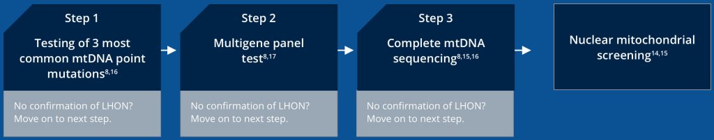 Please consult with your local genetics services to determine what testing options are available to you as this can differ depending on where you are in the UK. Steps 1 and 2 below can help detect the most common LHON mutations but may not be able to detect the rarer mutations. Please note that complete mtDNA and nuclear-mitochondrial screening require specialist referral.Footnote15